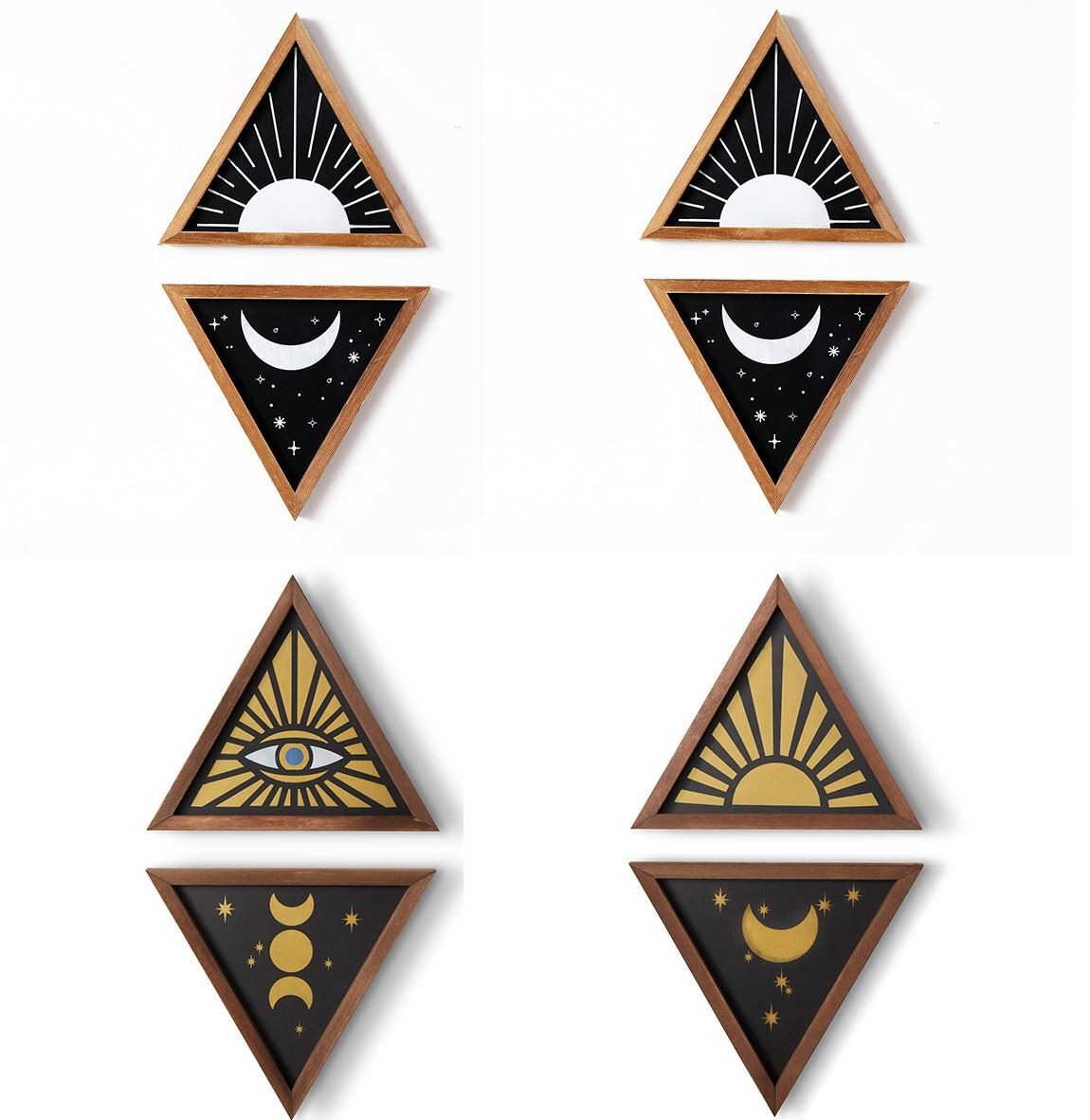 Trang Trí Nội Thất Trang Trí Tường Bộ 2 - Mặt Trời và Mặt Trăng Khung Tam Giác Gỗ Treo Tường cho Phòng Khách Phòng Ngủ, Tranh Tường Nghệ Thuật Hình Học Trên Gỗ